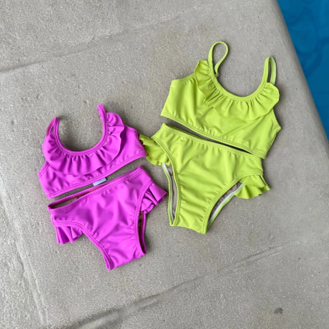 El top tiene diseño recto con breteles finos y tiras regulables, y la bombacha ofrece calce cómodo y seguro. Viene en dos versiones irresistibles: rosa chicle y verde limón, ambas con el toque único de Sofía Catalina 💖